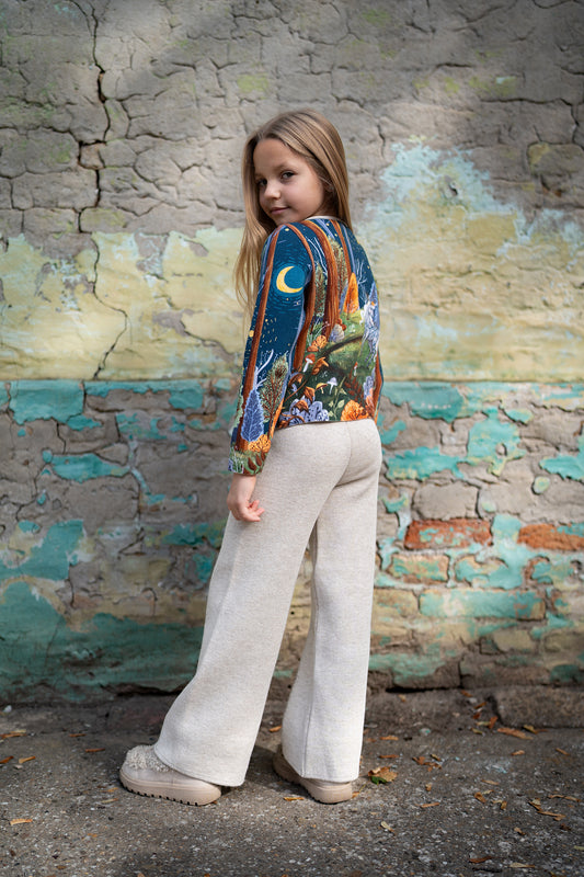 Za izbor veličine najbolje je pratiti visinu deteta. Krojevi su pažljivo prilagođeni dečijem rastu i pokretljivosti, pa kardigani uvek lepo stoje – bilo preko haljine, majice ili pantalona.