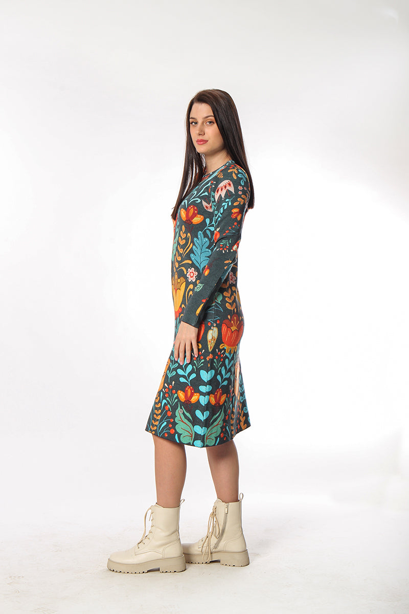 Predstavljamo vam štrikanu haljinu "Boemska Bašta". Ova haljina "Boemska Bašta" prikazuje cvetni dezen u etno stilu na petrol podlozi sa jakim kontrastima.
