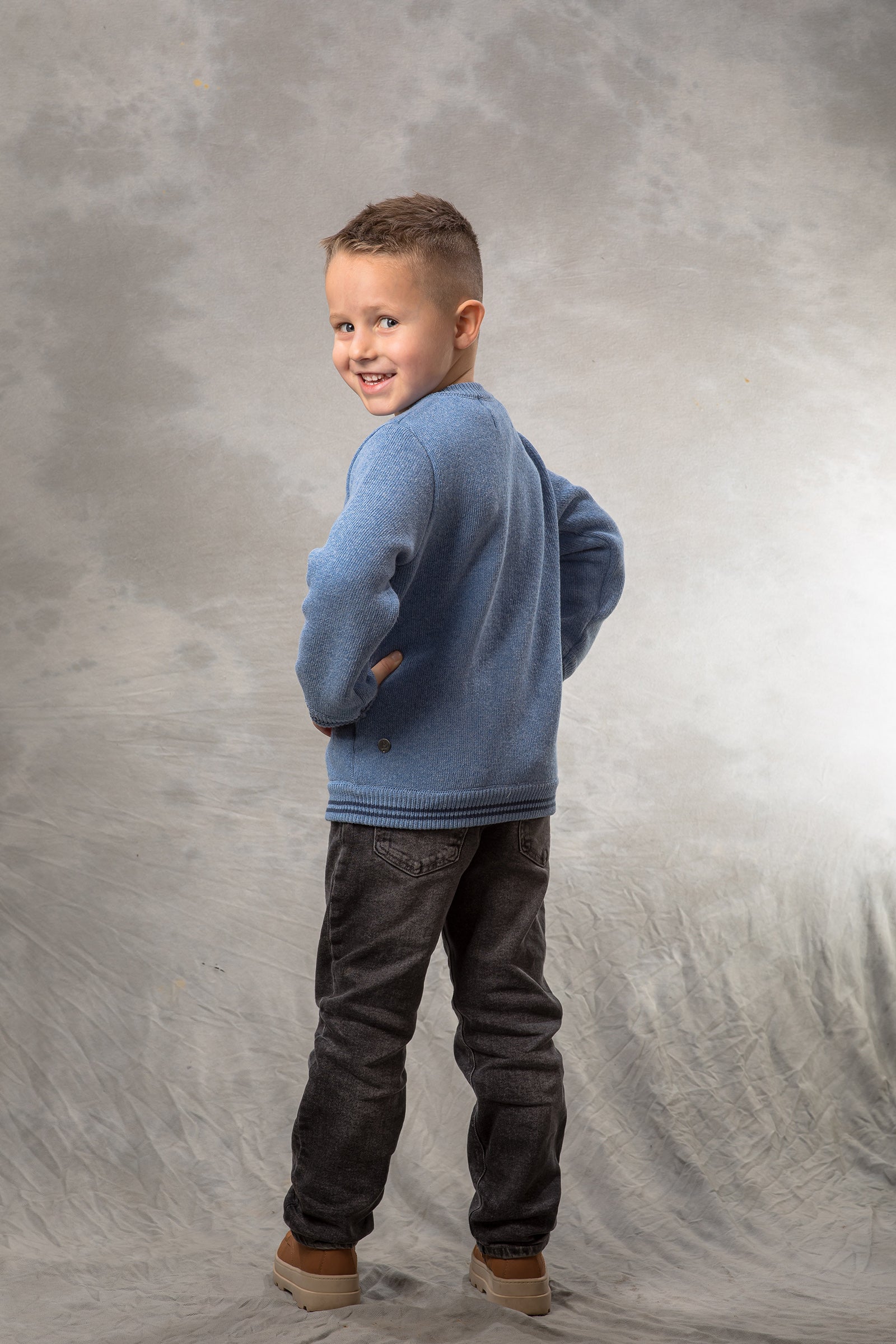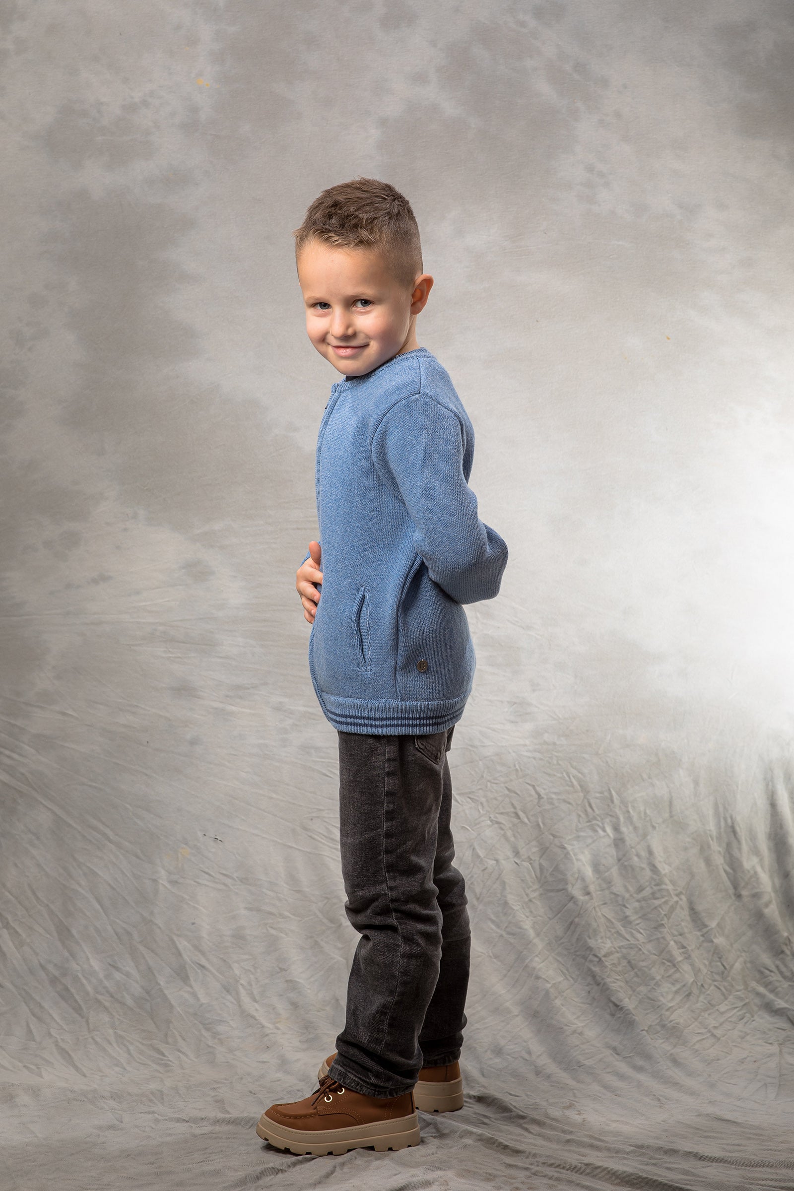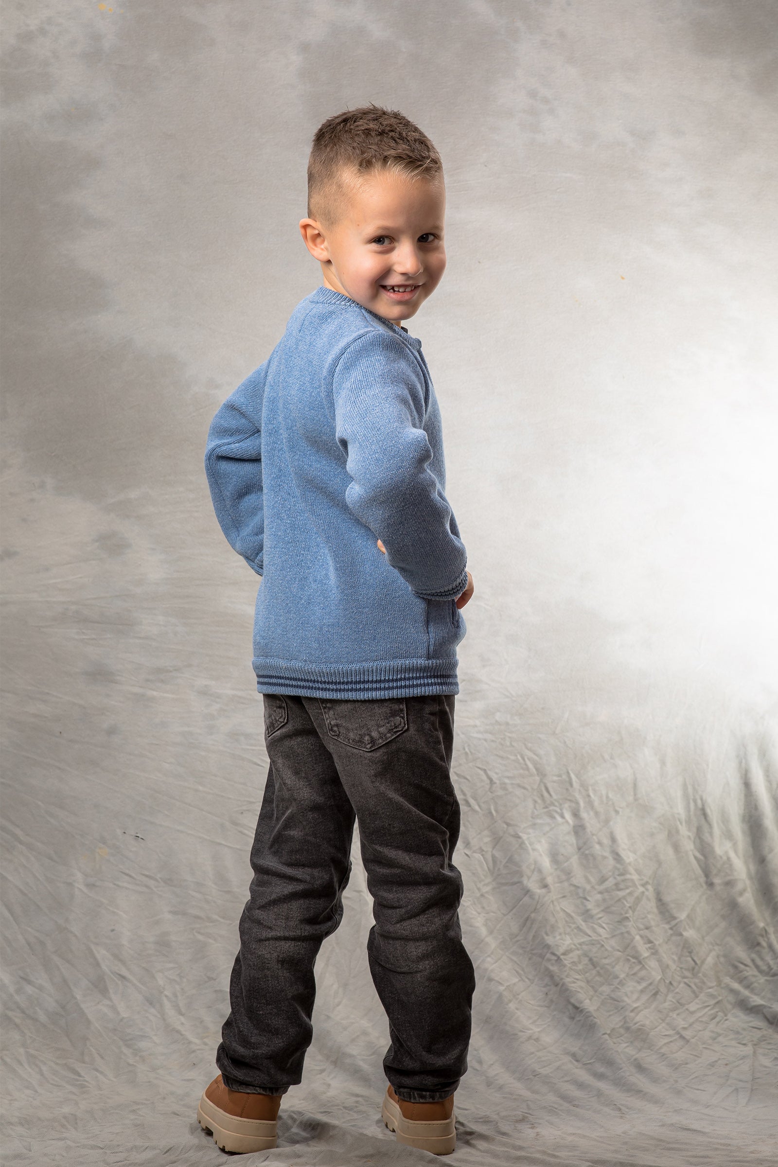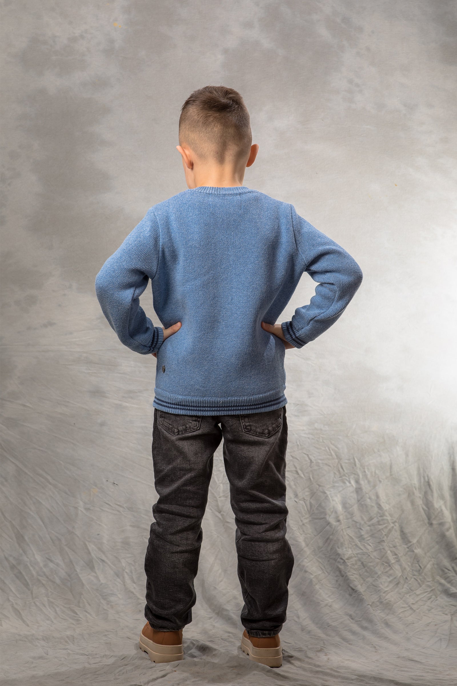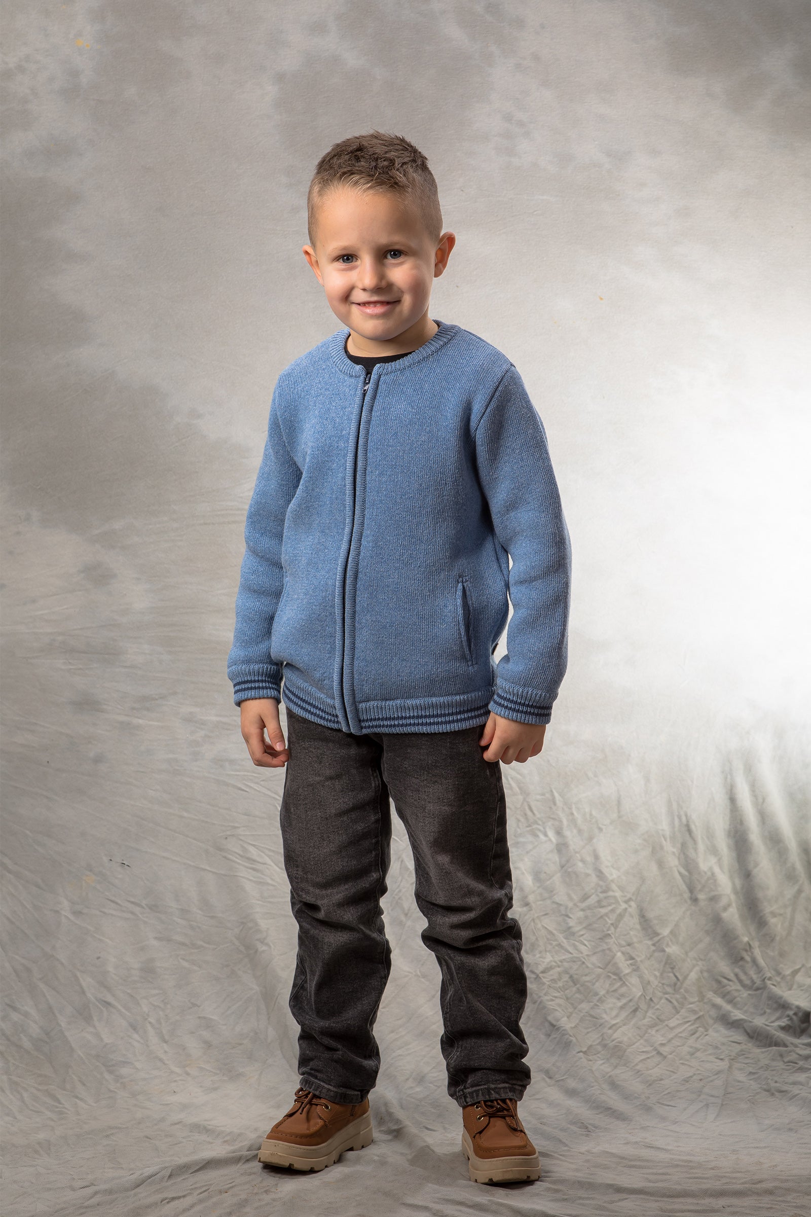 BAIKA „Solid Bomber Plavi” za dečake – jednobojni štrikani bomber koji se lako kombinuje uz sve; čist, moderan izgled i praktično nošenje svaki dan.