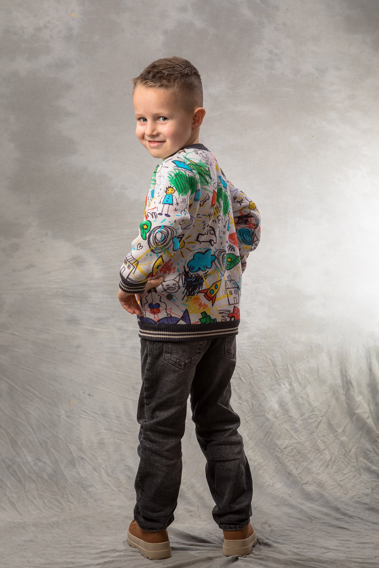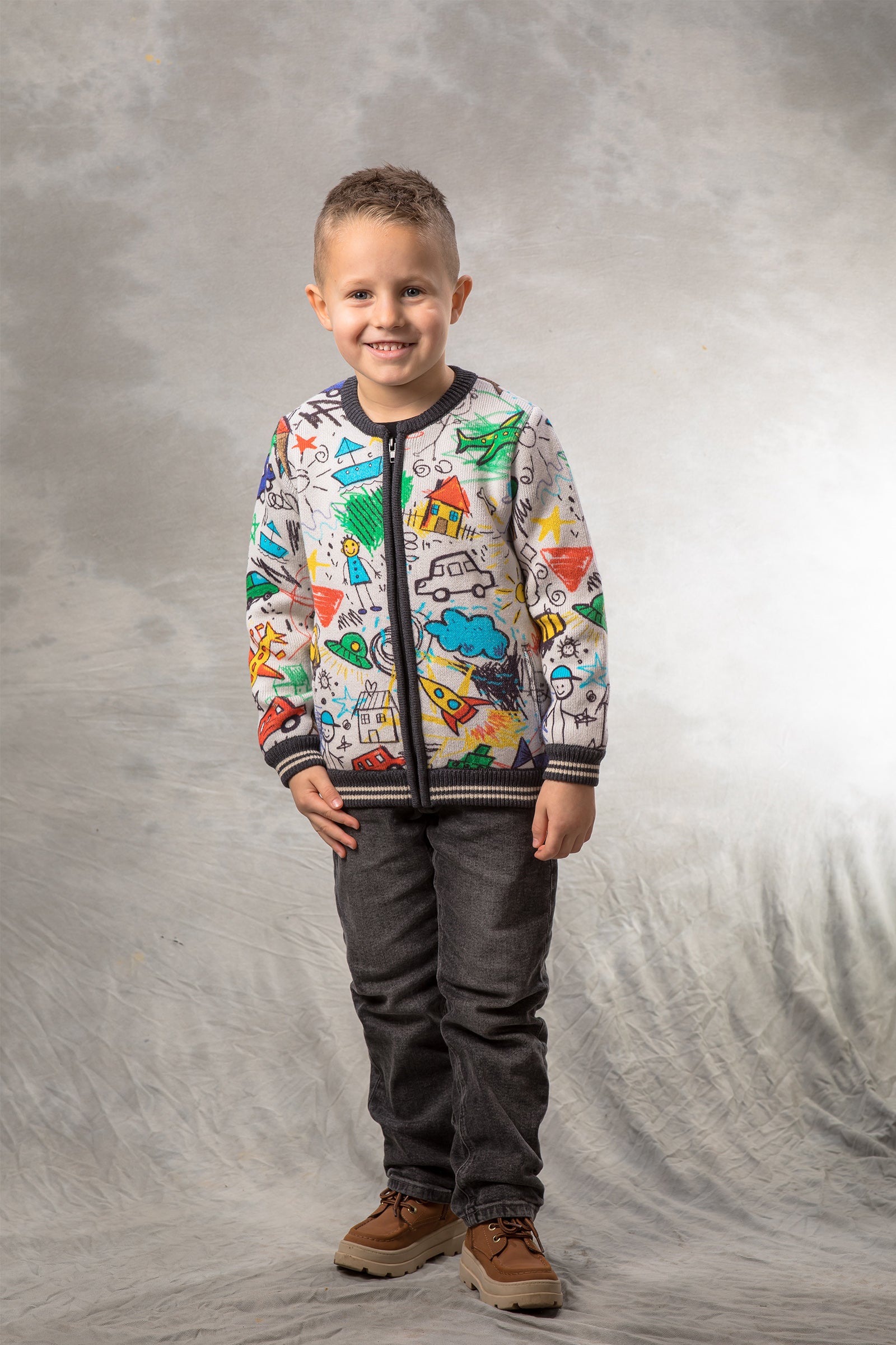 BAIKA „Sveska” bomber jakna za dečake – šareni, štrikani bomber sa motivima dečjih crteža (rakete, autići, kućice, oblaci); razigran izgled i praktično nošenje za svaki dan.
