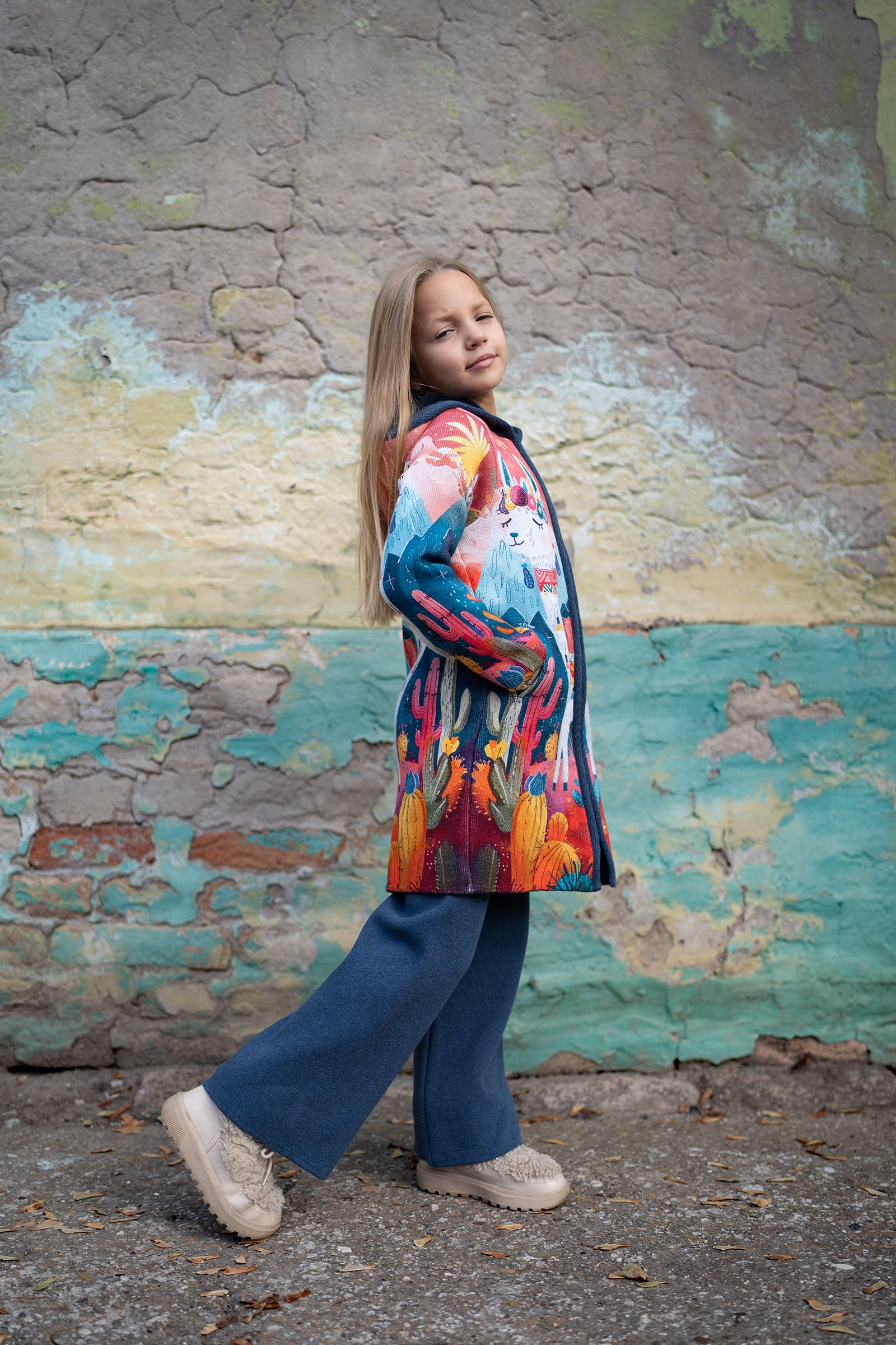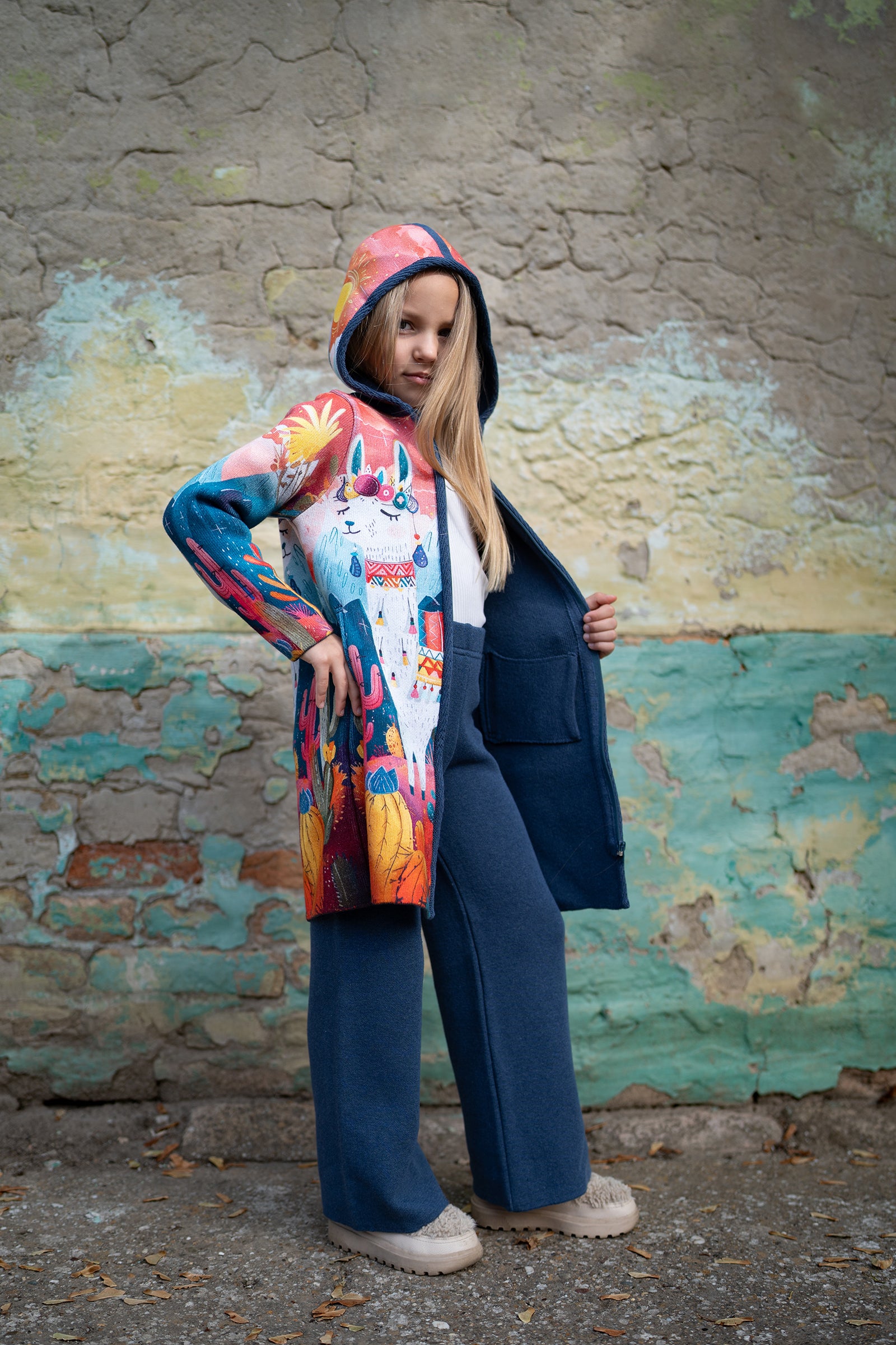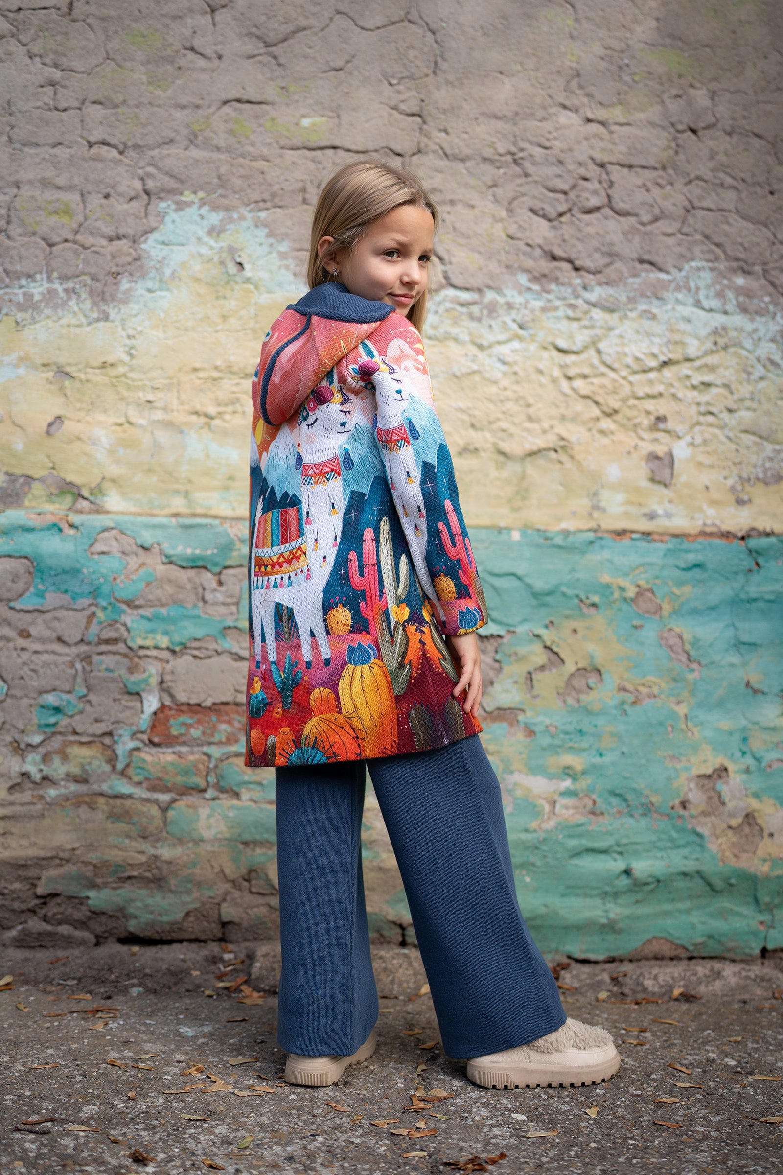Kaputić za devojčice „Lama“ donosi boje pustinje i šarm Južne Amerike u razigranom, bajkovitom tonu. Ovaj štrikani kaput kombinuje udobnost i maštoviti dizajn, sa simpatičnom lamom u glavnoj ulozi, stvarajući nezaboravan komad garderobe za male zaljubljenice . . .