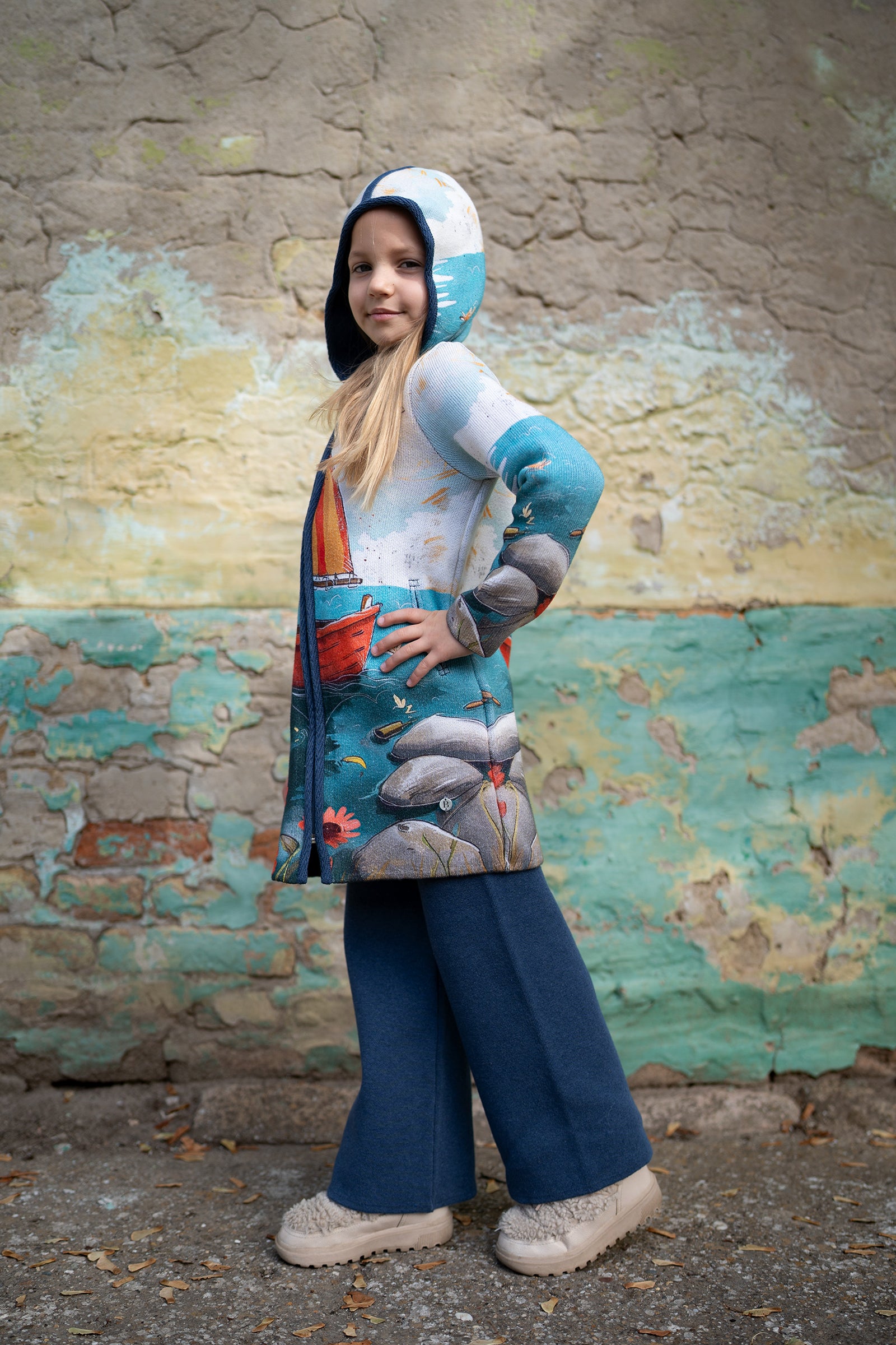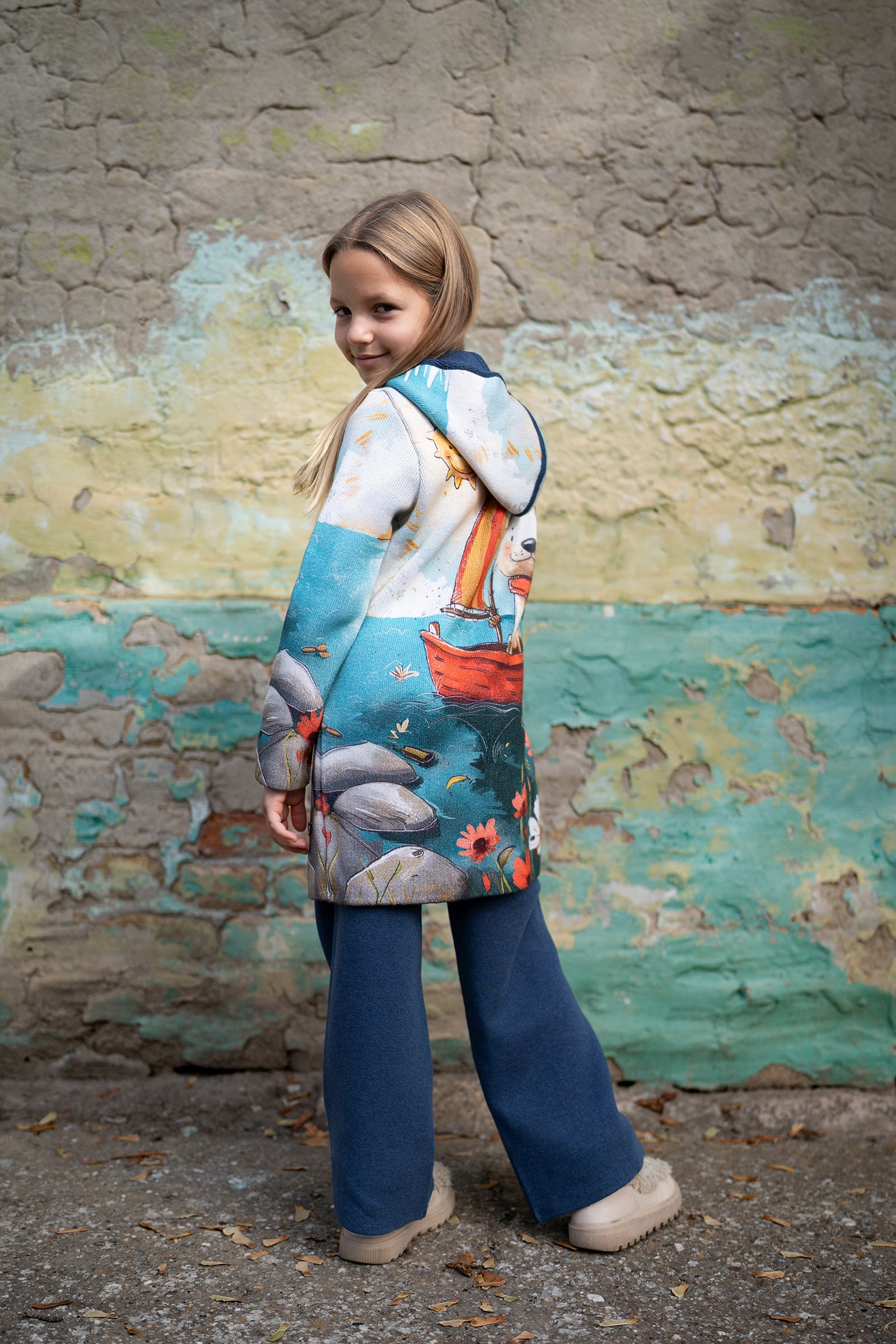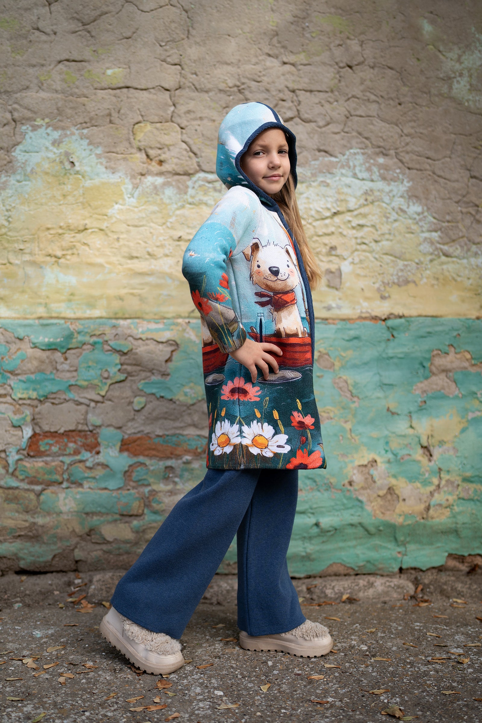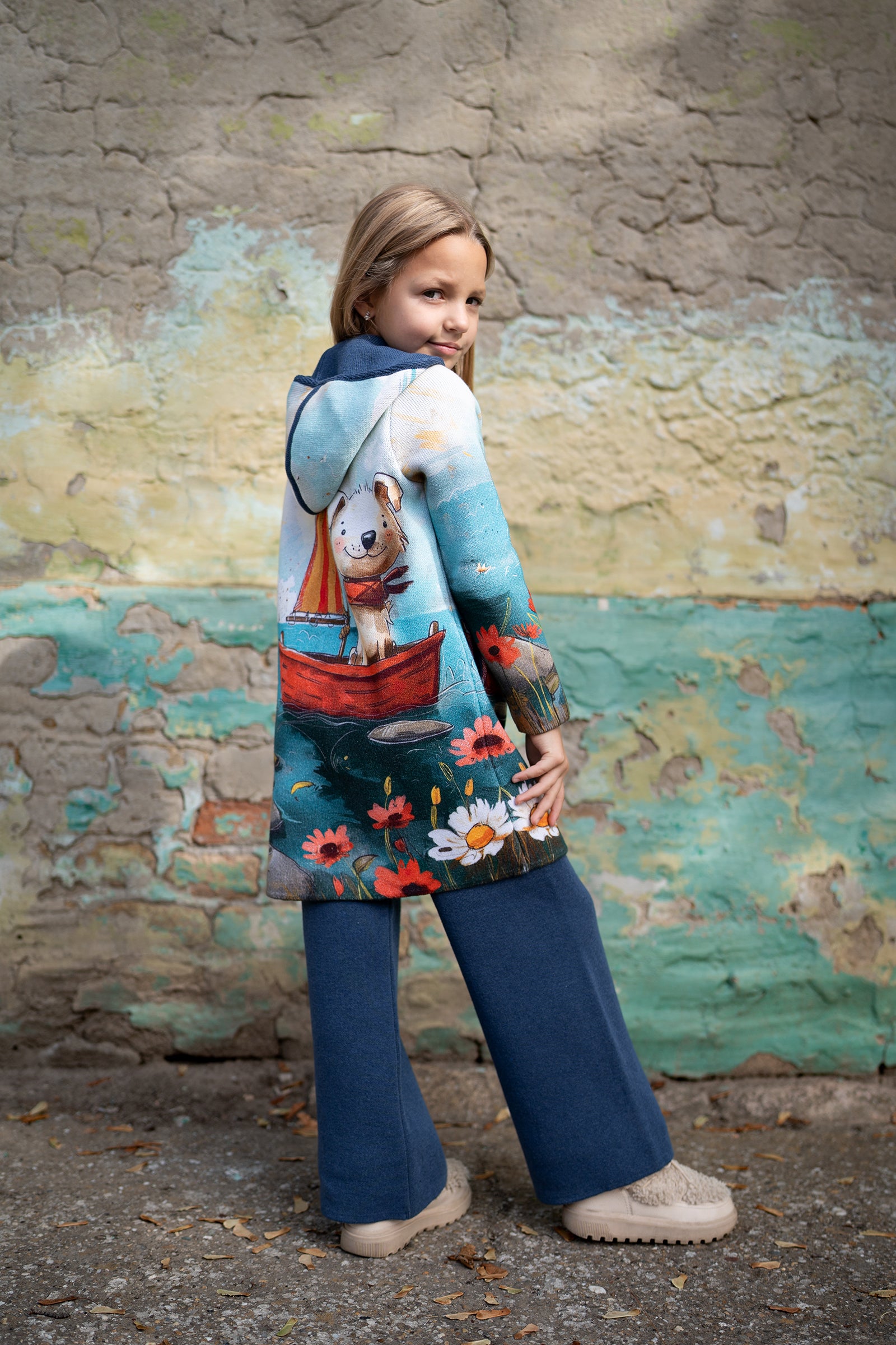Kaputić za devojčice „Mornar“ oslikava veselu priču o putovanju, mašti i toplini. Glavni junak – nasmejani mornar pas u čamcu – donosi razigranost i osmeh u svaku jesenju ili zimsku šetnju.
