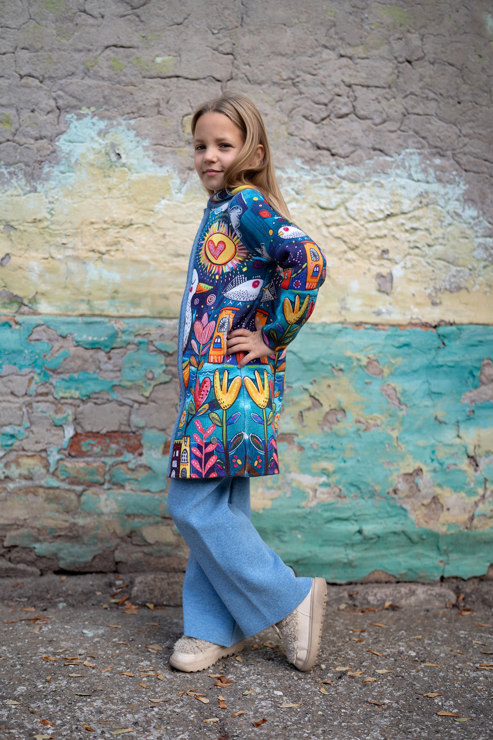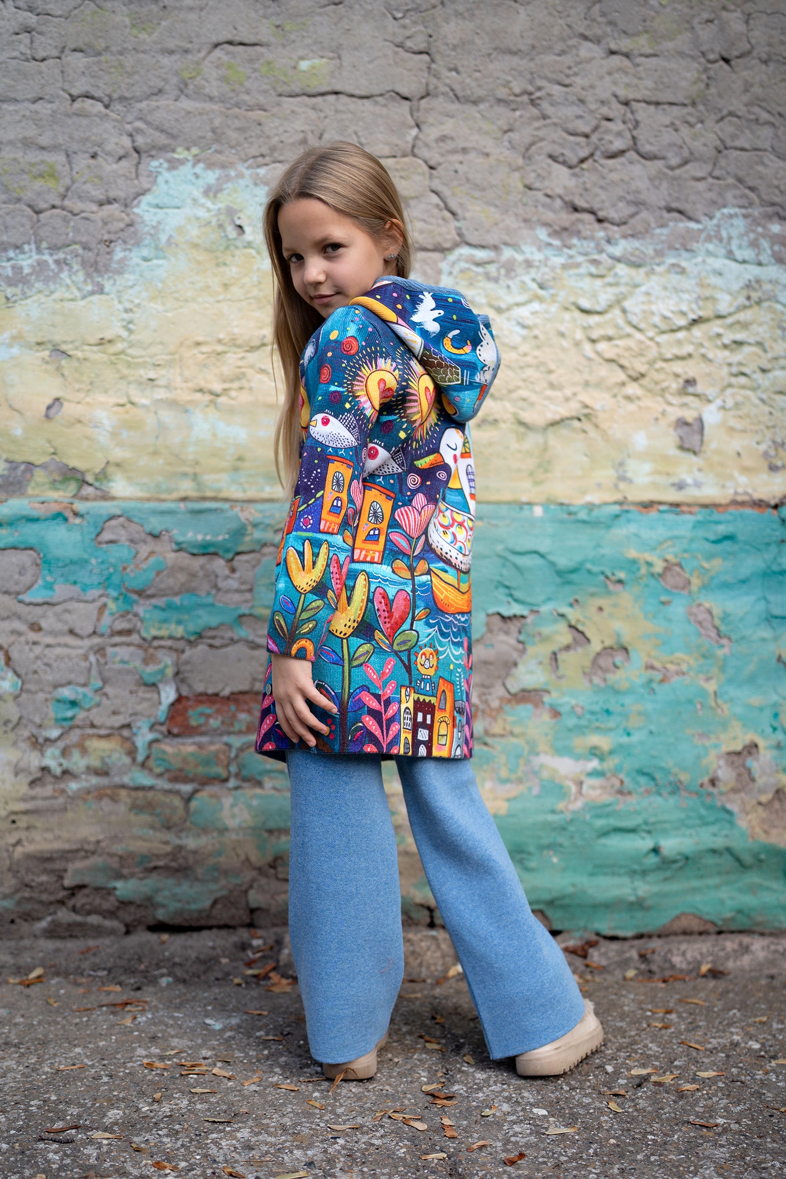 Kaputić za devojčice „Patka“ je šareni štrikani kaputić koji spaja bajkovite motive, vedre boje i lakoću nošenja – idealan za jesenje i prolećne avanture.