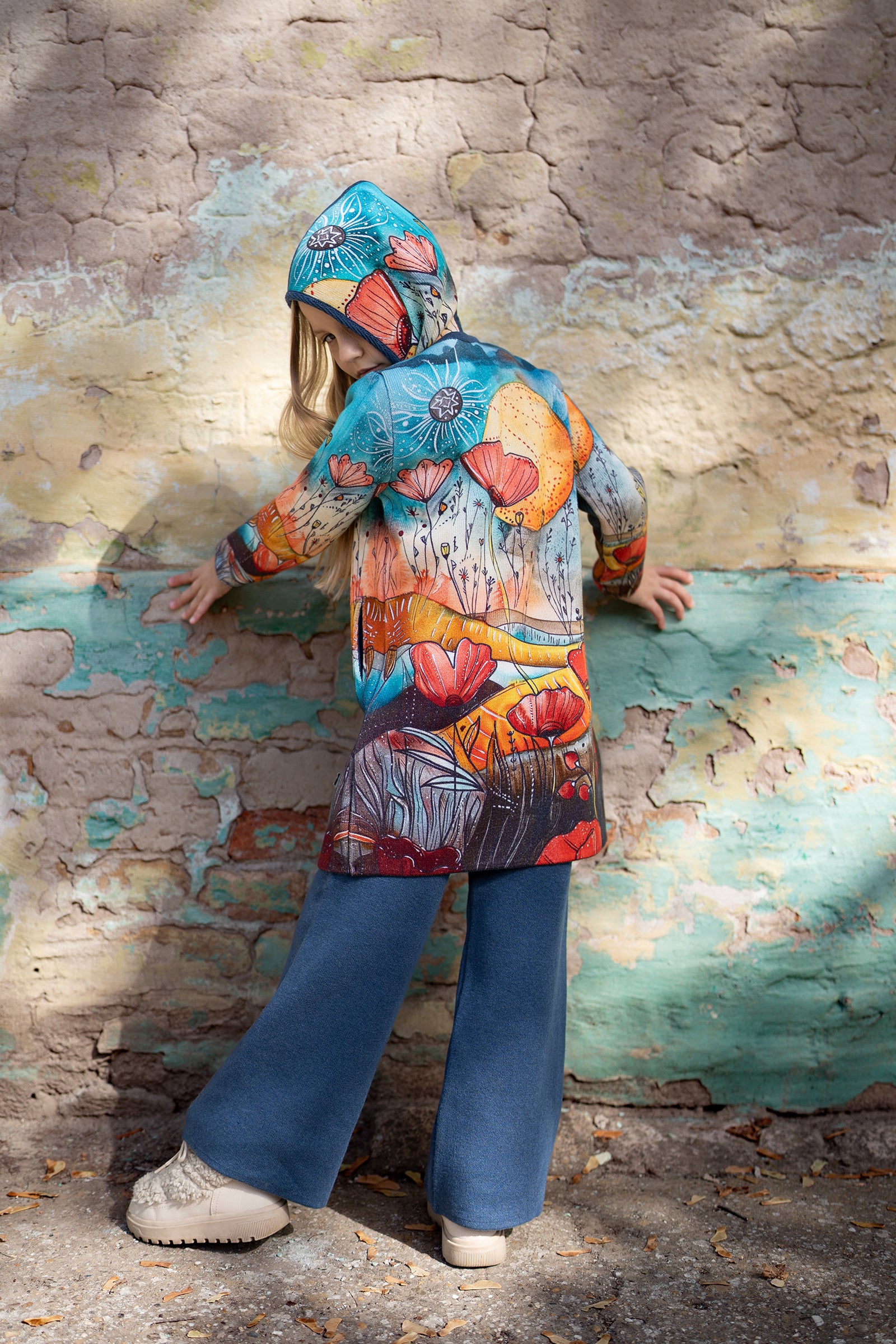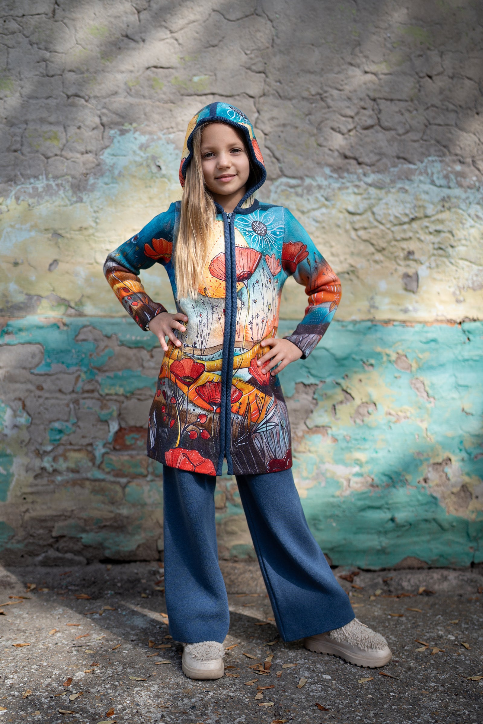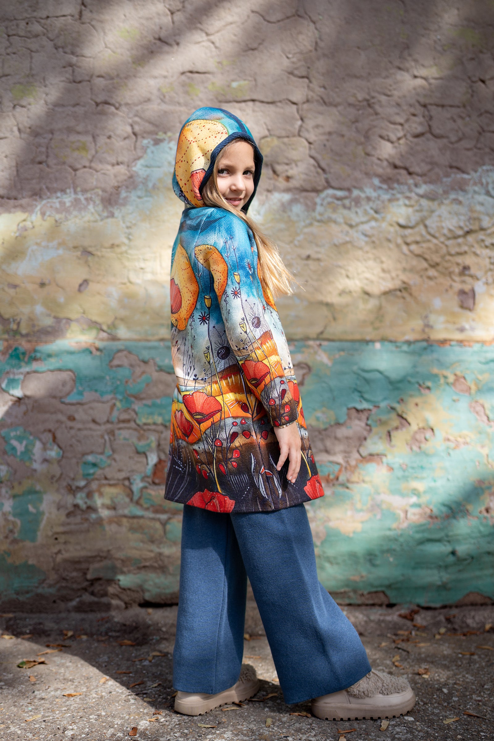 Kaputić za devojčice „Vojvodina“ – šareni štrikani kaputić koji priziva zlatnu ravnicu, crvene makove i veliko sunce; topla, nosiva bajka za svaki dan.