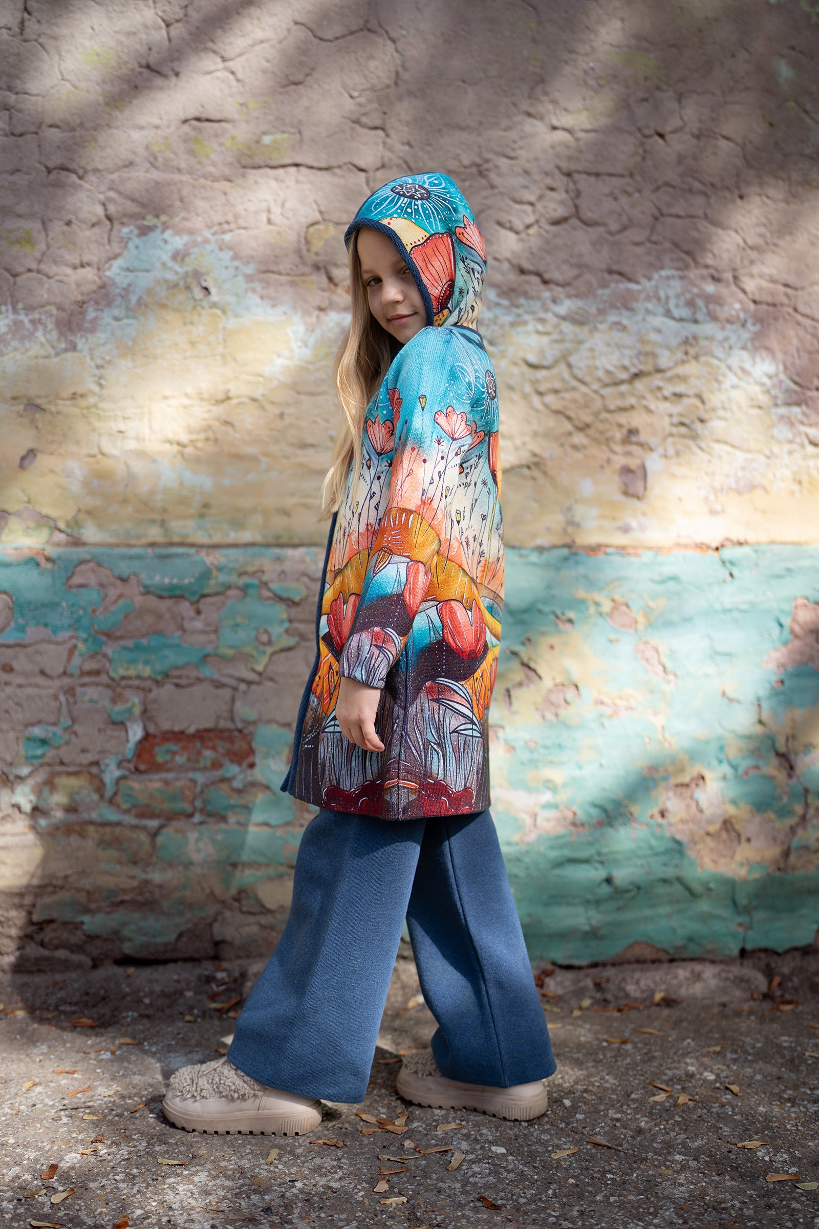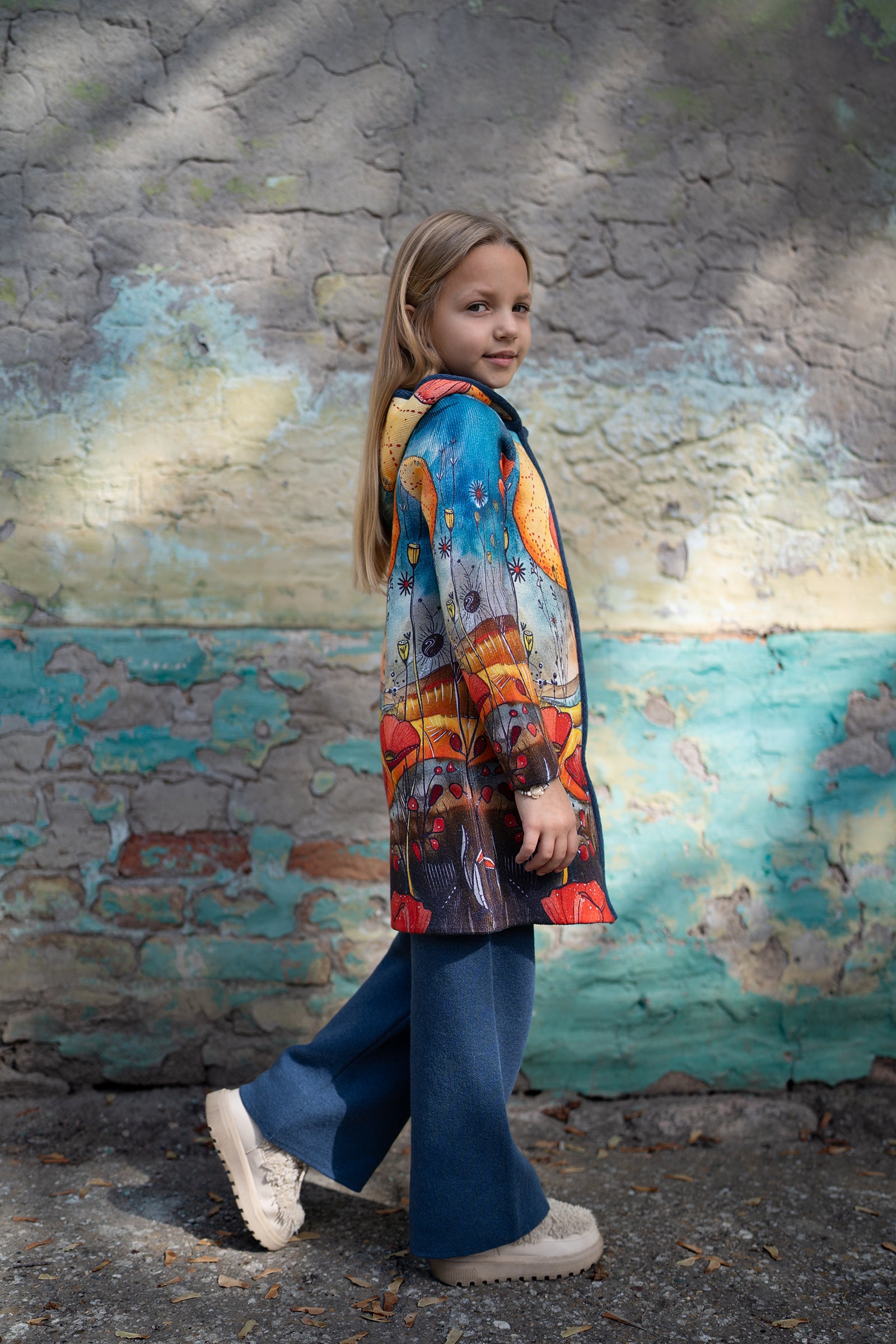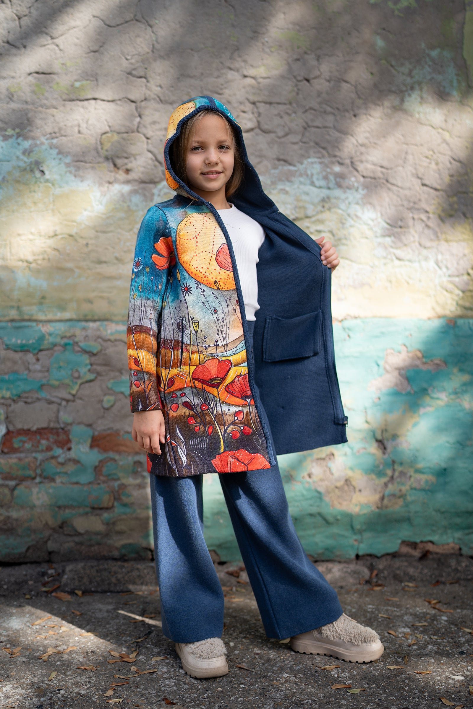 Kaputić za devojčice „Vojvodina“ – šareni štrikani kaputić koji priziva zlatnu ravnicu, crvene makove i veliko sunce; topla, nosiva bajka za svaki dan.