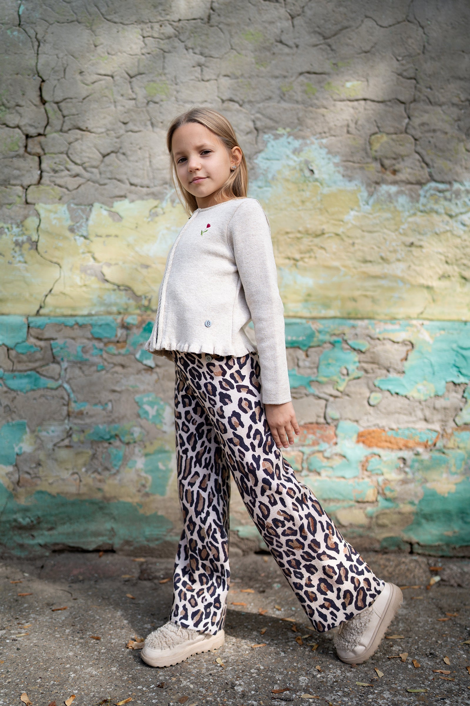 Zimske pantalone za devojčice „Leopard“ – tople pletene pantalone sa modernim animal printom; udobne, elastične i spremne za školu, igru i sve zimske bajke.