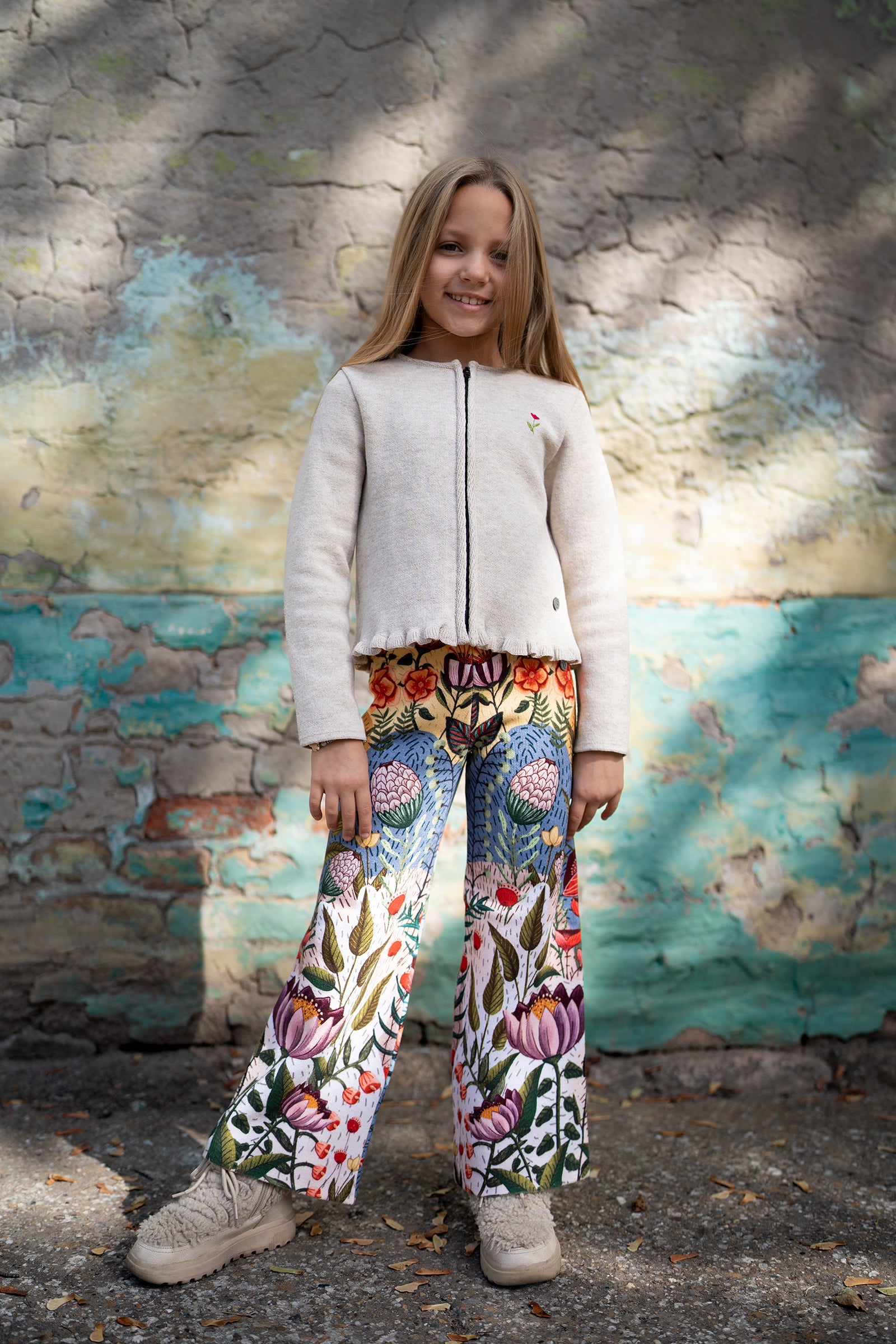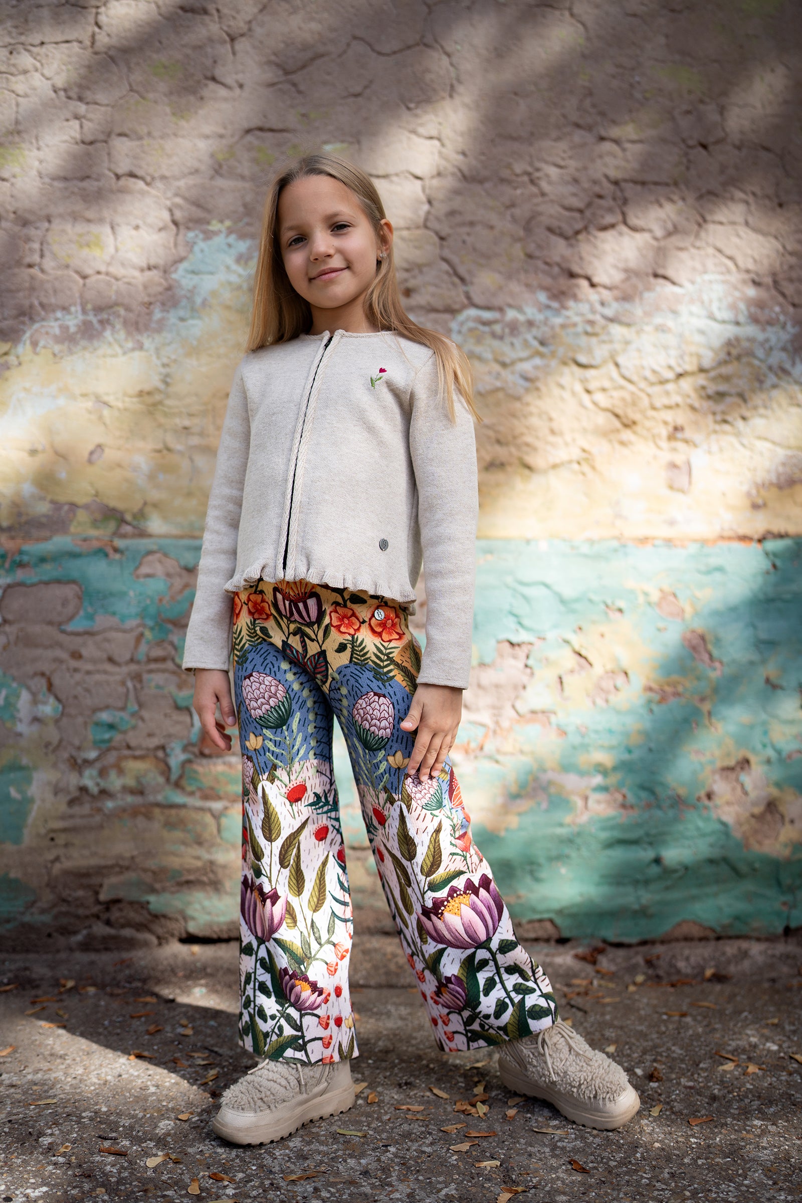 Zimske pantalone za devojčice „Proleće“ – šarene pletene pantalone sa floralnim motivima; lagane, tople i bajkovito udobne.
